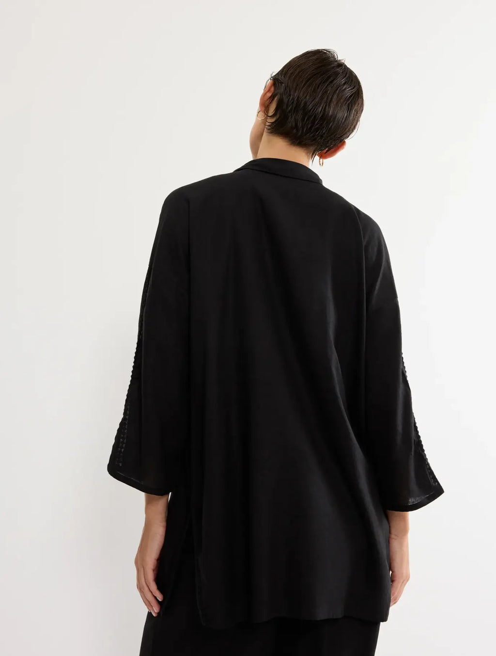 Questa versatile camicia con bottoni può essere indossata dalla città alla spiaggia come elegante copricostume. Realizzata in una morbida e traspirante miscela di lino, presenta delicati dettagli di rifinitura lungo le maniche e sui lati per un tocco raffinato.