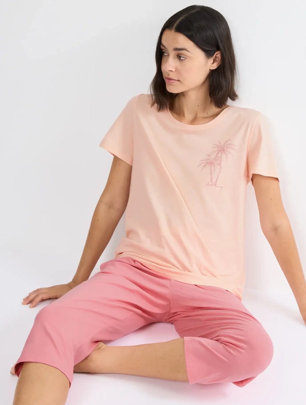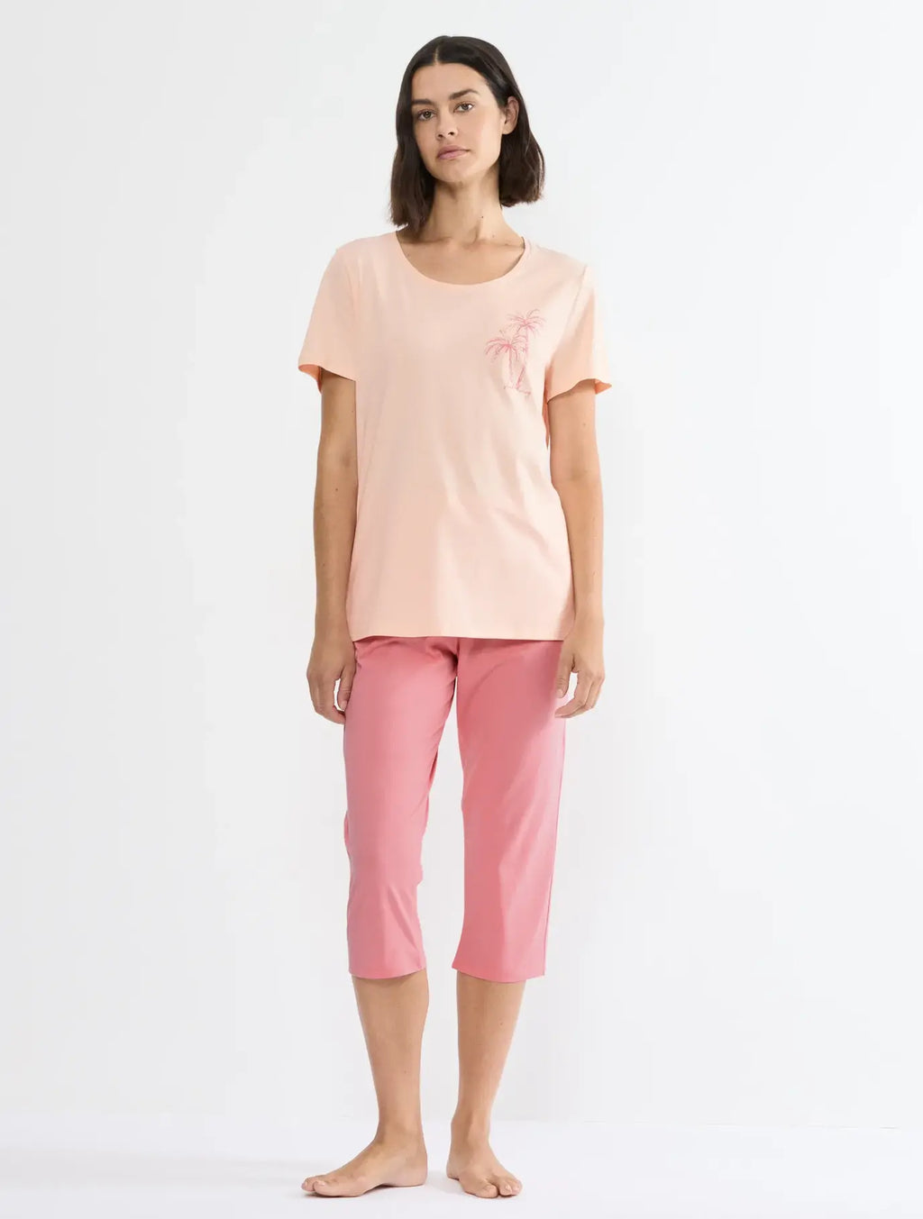 Set pigiama Capri, con Top a maniche corte, realizzato interamente in morbido e traspirante jersey di cotone.