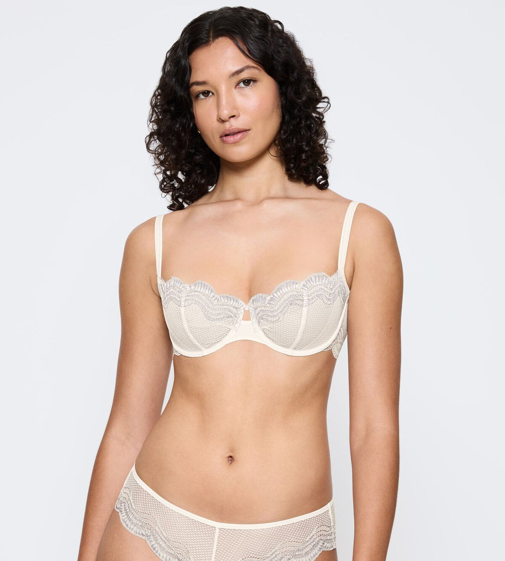 Con un taglio a balconcino che valorizza le forme, il pizzo bicolore e la combinazione di motivi grafici e floreali, questo reggiseno elegante per tutti i giorni diventerà il tuo capo di riferimento.